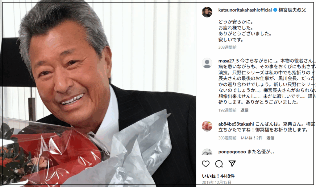 梅宮辰夫さんが2019年に亡くなった際には、高橋克典さんが記者会見を開いて追悼の言葉を述べています。
